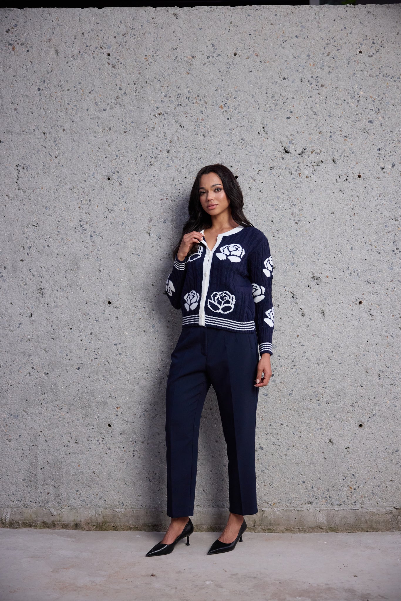 Chic, feminine, and effortlessly polished ,our Navy Blossom Knit Cardigan brings a modern twist to classic knitwear. Designed in a deep navy tone with bold white floral detailing, this cardigan makes a statement while still feeling timeless. The contrast trim along the front and hem adds a refined finish, giving it that tailored, elegant edge.